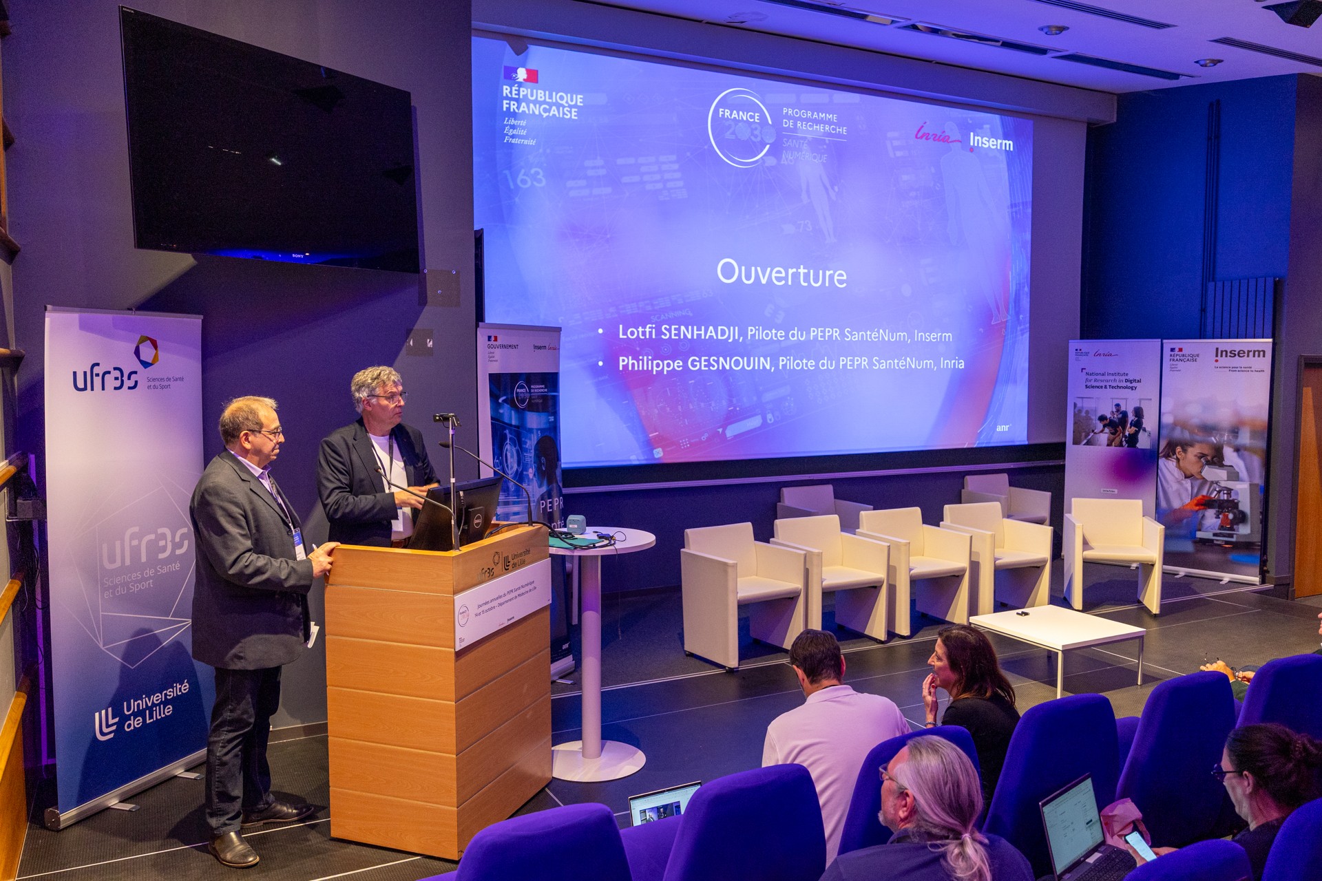 Les pilotes scientifiques, Lotfi Senhadji, professeur à l’Université de Rennes, pour l’Inserm, et Philippe Gesnouin, directeur du Programme numérique en santé d’Inria, ont ensuite pris la parole au nom du Comité de pilotage.